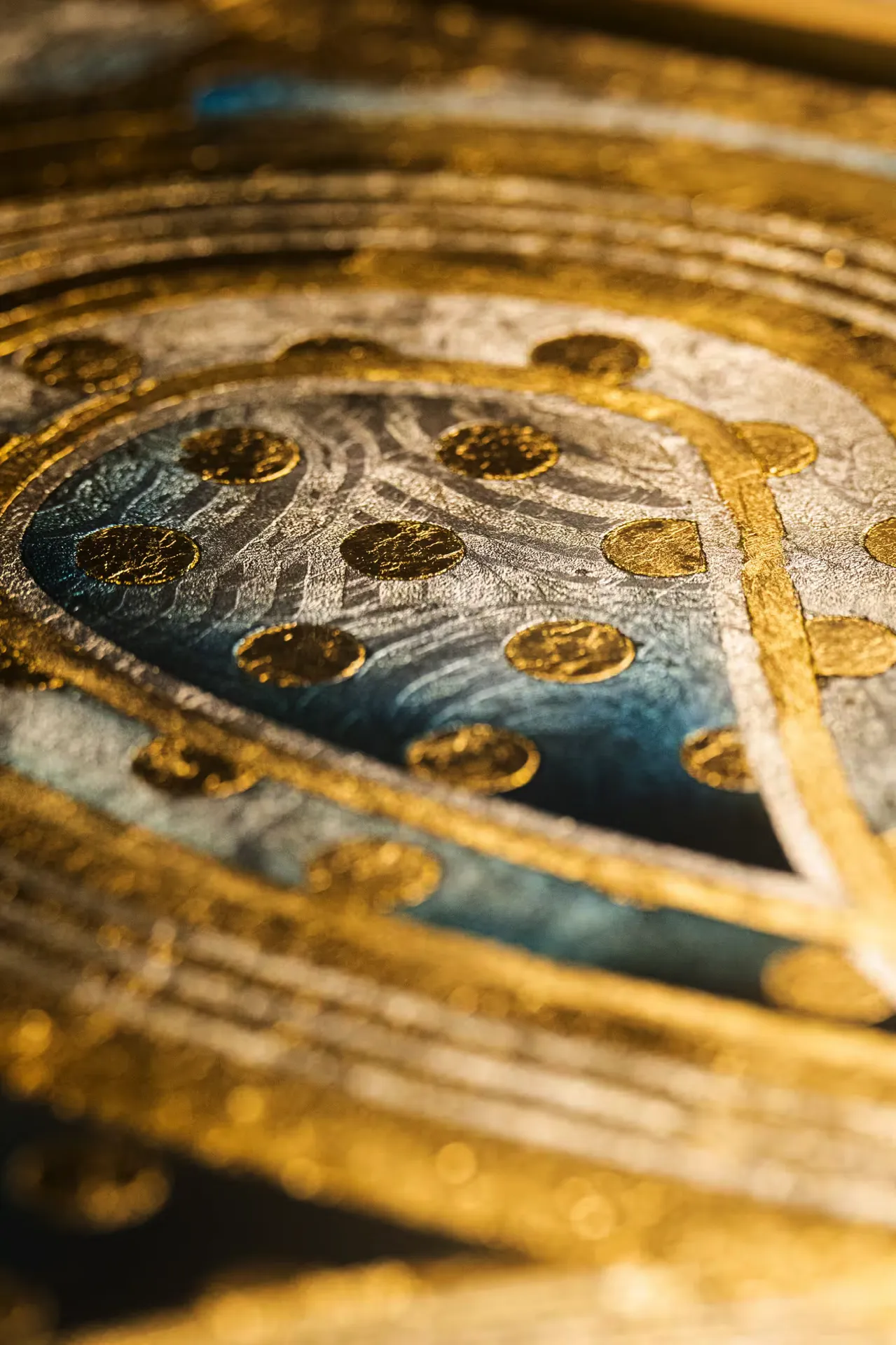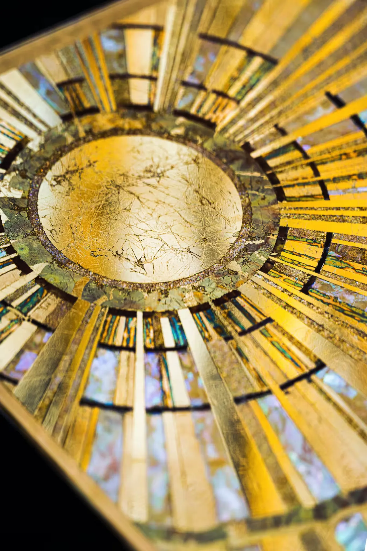 The work begins and ends with one set of hands. Marybeth has spent decades refining what gold, palladium, and glass can do together. Her finishes move between matte and mirror — surfaces that glow in low light and shift as you move through the room. She works with metal combinations most gilders avoid. Her conviction is simple: some spaces deserve surfaces with weight.